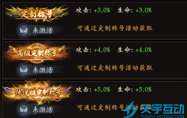 定制称号:字数在2-4字之间,称号属性:攻击+3%,生命+3%