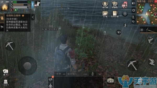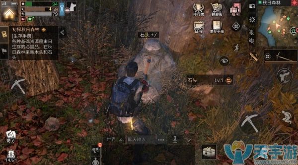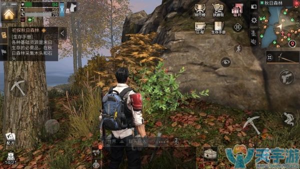简单的了解之后我们就可以开始探索以及采集资源了。秋日森林的资源非常丰富,小版在这里只列出可获得的部分资源,更多的内容还需要玩家们在游戏中多多探索,比如说隐秘的山洞什么的(别说是我告诉你们的)