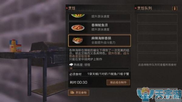 而第二种“隐藏食物”呢,游戏君觉得还是相当不错的~这个名为“麻辣海鲜香锅”的食物堪称是麻辣香锅的“升级版”~需要1个穿天椒、1个对虾、1个鱿鱼、1个梭子蟹即可制作!值得一提的是,这个“麻辣海鲜香锅”的属性还是不错的,可以提升4种属性哦!