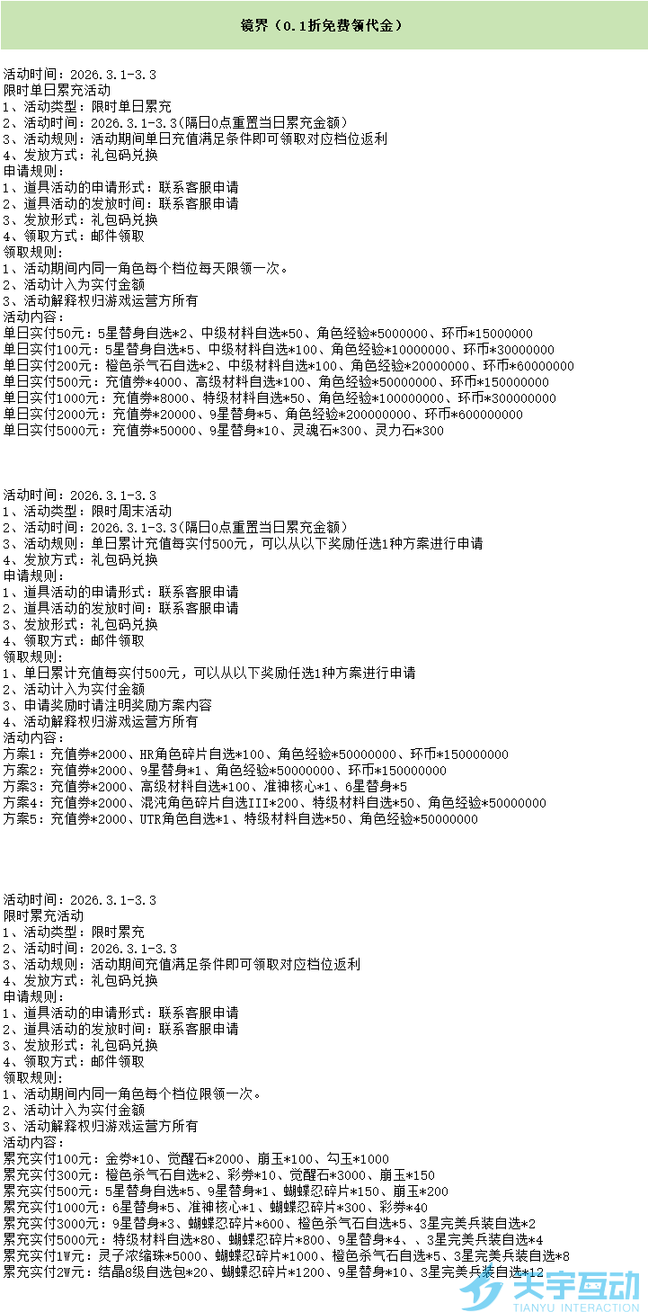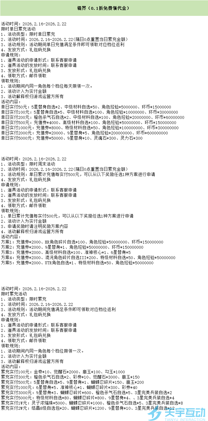 镜界(0.1折免费领代金)活动时间:2026.2.6-2026.2.8限时单日累充活动1、活动类型:限时单日累充2、活动时间:2026.2.6-2026.2.8(隔日0点重置当日累充金额)3、活动规则:活动期间单日充值满足条件即可领取对应档位返利4、发放方式:礼包码兑换申请规则:1、道具活动的申请形式:联系客服申请2、道具活动的发放时间:联系客服申请3、发放形式:礼包码兑换4、领取方式:邮件领取领取规则:1、活动期间内同一角色每个档位每天限领一次。2、活动计入为实付金额3、活动解释权归游戏运营方所有活动内容:单日实付50元:5星替身自选*2、中级材料自选*50、角色经验*5000000、环币*15000000单日实付100元:5星替身自选*5、中级材料自选*100、角色经验*10000000、环币*30000000单日实付200元:橙色杀气石自选*2、中级材料自选*100、角色经验*20000000、环币*60000000单日实付500元:充值券*4000、高级材料自选*100、角色经验*50000000、环币*150000000单日实付1000元:充值券*8000、特级材料自选*50、角色经验*100000000、环币*300000000单日实付2000元:充值券*20000、9星替身*5、角色经验*200000000、环币*600000000单日实付5000元:充值券*50000、9星替身*10、灵魂石*300、灵力石*300活动时间:2026.2.6-2026.2.81、活动类型:限时周末活动2、活动时间:2026.2.6-2026.2.8(隔日0点重置当日累充金额)3、活动规则:单日累计充值每实付500元,可以从以下奖励任选1种方案进行申请4、发放方式:礼包码兑换申请规则:1、道具活动的申请形式:联系客服申请2、道具活动的发放时间:联系客服申请3、发放形式:礼包码兑换4、领取方式:邮件领取领取规则:1、单日累计充值每实付500元,可以从以下奖励任选1种方案进行申请2、活动计入为实付金额3、申请奖励时请注明奖励方案内容4、活动解释权归游戏运营方所有活动内容:方案1:充值券*2000、HR角色碎片自选*100、角色经验*50000000、环币*150000000方案2:充值券*2000、9星替身*1、角色经验*50000000、环币*150000000方案3:充值券*2000、高级材料自选*100、准神核心*1、6星替身*5方案4:充值券*2000、混沌角色碎片自选III*200、特级材料自选*50、角色经验*50000000方案5:充值券*2000、UTR角色自选*1、特级材料自选*50、角色经验*50000000活动时间:2026.2.6-2026.2.8限时累充活动1、活动类型:限时累充2、活动时间:2026.2.6-2026.2.83、活动规则:活动期间充值满足条件即可领取对应档位返利4、发放方式:礼包码兑换申请规则:1、道具活动的申请形式:联系客服申请2、道具活动的发放时间:联系客服申请3、发放形式:礼包码兑换4、领取方式:邮件领取领取规则:1、活动期间内同一角色每个档位限领一次。2、活动计入为实付金额3、活动解释权归游戏运营方所有活动内容:累充实付100元:金劵*10、觉醒石*2000、崩玉*100、勾玉*1000累充实付300元:橙色杀气石自选*2、彩券*10、觉醒石*3000、崩玉*150累充实付500元:5星替身自选*5、9星替身*1、蝴蝶忍碎片*150、崩玉*200累充实付1000元:6星替身*5、准神核心*1、蝴蝶忍碎片*300、彩券*40累充实付3000元:9星替身*3、蝴蝶忍碎片*600、橙色杀气石自选*5、3星完美兵装自选*2累充实付5000元:特级材料自选*80、蝴蝶忍碎片*800、9星替身*4、、3星完美兵装自选*4累充实付1W元:灵子浓缩珠*5000、蝴蝶忍碎片*1000、橙色杀气石自选*5、3星完美兵装自选*8累充实付2W元:结晶8级自选包*20、蝴蝶忍碎片*1200、9星替身*10、3星完美兵装自选*12