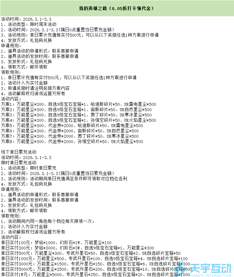 我的英雄之路(0.05折打卡领代金)活动时间:2026.2.6-2026.2.81、活动类型:限时周末活动2、活动时间:2026.2.6-2026.2.8(隔日0点重置当日累充金额)3、活动规则:单日累计充值每实付500元,可以从以下奖励任选1种方案进行申请4、发放方式:礼包码兑换申请规则:1、道具活动的申请形式:联系客服申请2、道具活动的发放时间:联系客服申请3、发放形式:礼包码兑换4、领取方式:邮件领取领取规则:1、单日累计充值每实付500元,可以从以下奖励任选1种方案进行申请2、活动计入为实付金额3、申请奖励时请注明奖励方案内容4、活动解释权归游戏运营方所有活动内容:方案1:万能星尘*300、自选9级宝石宝箱*1、哈迪斯碎片*50、UR雷电星尘*500方案2:万能星尘*300、自选9级宝石宝箱*1、宙斯碎片*50、UR自然星尘*500方案3:万能星尘*300、自选9级宝石宝箱*1、奥丁碎片*50、UR寒冰星尘*500方案4:万能星尘*300、自选9级宝石宝箱*1、孙悟空碎片*50、UR火焰星尘*500方案5:万能星尘*300、代金券*2000、哈迪斯碎片*50、UR雷电星尘*500方案6:万能星尘*300、代金券*2000、宙斯碎片*50、UR自然星尘*500方案7:万能星尘*300、代金券*2000、奥丁碎片*50、UR寒冰星尘*500方案8:万能星尘*300、代金券*2000、孙悟空碎片*50、UR火焰星尘*500线下单日累充活动活动时间:2026.2.6-2026.2.8限时单日累充活动1、活动类型:限时单日累充2、活动时间:2026.2.6-2026.2.8(隔日0点重置当日累充金额)3、活动规则:活动期间单日充值满足条件即可领取对应档位返利4、发放方式:礼包码兑换申请规则:1、道具活动的申请形式:联系客服申请2、道具活动的发放时间:联系客服申请3、发放形式:礼包码兑换4、领取方式:邮件领取领取规则:1、活动期间内同一角色每个档位每天限领一次。2、活动计入为实付金额3、活动解释权归游戏运营方所有活动内容:单日实付100元:梦钻*1000、幻阶石*1W、万能星尘*100单日实付300元:梦钻*3000、幻阶石*3W、自选9级宝石宝箱*1、万能星尘*300单日实付500元:万能星尘*300、专武升星石*50、自选9级宝石宝箱*2、UR自选碎片宝箱*50单日实付1000元:万能星尘*500、专武升星石*100、自选9级宝石宝箱*4、UR自选碎片宝箱*100单日实付3000元:万能星尘*1500、专武升星石*150、自选9级宝石宝箱*6、UR自选碎片宝箱*300单日实付5000元:万能星尘*2500、专武升星石*200、自选9级宝石宝箱*10、UR自选碎片宝箱*500单日实付1W元:万能星尘*5000、专武升星石*250、自选9级宝石宝箱*20、UR自选碎片宝箱*1000