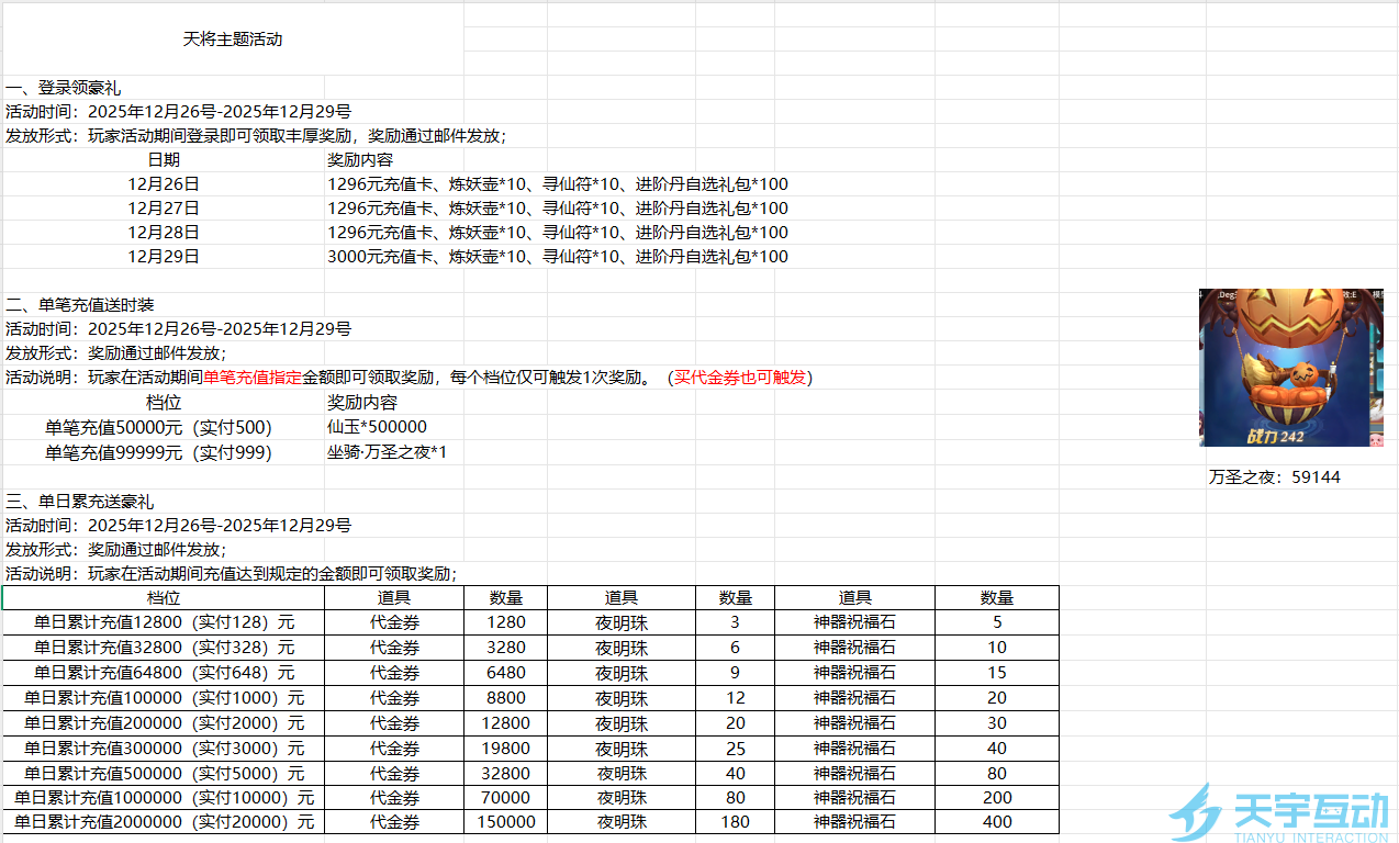 《仙灵物语0.1》-立春限时活动一、登录领豪礼1、活动时间:2026年2月4日-2026年2月7日2、发放形式:玩家活动期间登录即可领取丰厚奖励,奖励通过邮件发放;3、活动奖励:2月4日:1296元充值卡、炼妖壶*10、寻仙符*10、进阶丹自选礼包*100 2月5日:1296元充值卡、炼妖壶*10、寻仙符*10、进阶丹自选礼包*1002月6日:1296元充值卡、炼妖壶*10、寻仙符*10、进阶丹自选礼包*100 2月7日:3000元充值卡、炼妖壶*10、寻仙符*10、进阶丹自选礼包*100 二、单笔充值送时装 1、活动时间:2026年2月4日-2026年2月7日 2、发放形式:奖励通过邮件发放; 3、活动说明:玩家在活动期间单笔充值指定金额即可领取奖励,每个档位仅可触发1次奖励。(买代金券也可触发) 4、活动奖励单笔充值50000元(实付500):仙玉*500000 单笔充值99999元(实付999):坐骑·玉簪飞廉*1 玉簪飞廉:59233三、单日累充送豪礼 1、活动时间:2026年2月4日-2026年2月7日 2、发放形式:奖励通过邮件发放; 3、活动说明:玩家在活动期间充值达到规定的金额即可领取奖励; 4、活动奖励:单日累计充值12800(实付128)元:代金券*1280、夜明珠*3、神器祝福石*5单日累计充值32800(实付328)元:代金券*3280、夜明珠*6、神器祝福石*10单日累计充值64800(实付648)元:代金券*6480、夜明珠*9、神器祝福石*15单日累计充值100000(实付1000)元:代金券*8800、夜明珠*12、神器祝福石*20单日累计充值200000(实付2000)元:代金券*12800、夜明珠*20、神器祝福石*30单日累计充值300000(实付3000)元:代金券*19800、夜明珠*25、神器祝福石*40单日累计充值500000(实付5000)元:代金券*32800、夜明珠*40、神器祝福石*80单日累计充值1000000(实付10000)元:代金券*70000、夜明珠*80、神器祝福石*200单日累计充值2000000(实付20000)元:代金券*150000、夜明珠*180、神器祝福石*400